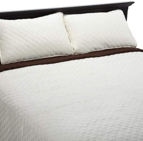 100-Percent cotton sateen, 300-thread count, 3-piece reversible (to chocolate) solid quilt set, fabric is calendared & mercerized for long lasting comfort and quality, quilt has diamond pattern stitching and bias tape edges, 2 shams have an envelope closure with bias tape edges, Full/Queen quilt 90 by 90 w/2 shams 26 by 20.