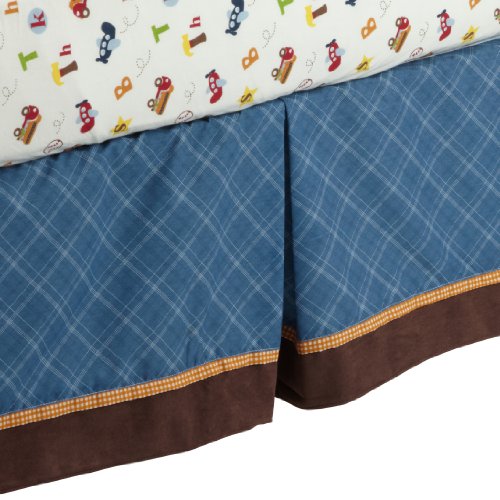 A to Z Boys is colorful and dynamic, it's a perfect collection for active little boys. The collection features a classic combination of checks, plaids and textured fabrics such as faux suede and corduroy in vibrant colors of green, blue, red and tan with accents of orange and yellow. The patchwork quilt and accessories showcase all boys' favorite icons embellished with top stitching and embroidery details. The A to Z Boys 8 Piece baby crib bedding set includes: quilt, dust ruffle, fitted sheet, window valance, diaper stacker and 3 fabric wall hangings. The bumper is sold separately. The quilt measures 40" x 47". The dust ruffle has a 14" drop, and the fitted sheet is designed to fit a standard size 28" x 52" crib mattress. The wall hangings each measure 11" x 10". The valance is 53" across with a 15" drop, including a 3" valance rod pocket. The diaper stacker measures 25" x 12", and is 9" deep. The sheet is made of 100% cotton. The other pieces are made of 65% polyester-35% cotton blend fabrics. Filling is 100% polyester fiber batting. Care instructions: machine wash cold separately, do not bleach, tumble dry low and remove promptly, and iron on low when needed.