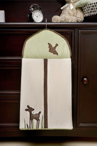 Fawns frolic in this beautiful organic cotton crib set. Your nursery will feel peaceful and serene surrounded with soothing shades of browns and greens. Slip covers are made with 100% organic cotton and polyester fill. With no harmful chemicals used to produce this bedding, you can rest assured that your little one is safe, comfortable and stylish. Duvet cover and insert: 36 x 45 inches, 100% organic cotton cover, polyester insert Dust ruffle: 14-inch drop, 100% organic cotton Fitted sheet: 100% organic cotton. Fits standard size crib mattress. Diaper stacker: 100% organic cotton.