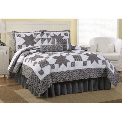 QS7758BW7K-2513 Size: King Features: -Filled material: 100pct Hypoallergenic polyester.-3 Bonus pillows, breakfast and a neck roll. Includes: -Set includes: 1 Quilt, 2 standard shams and 1 bed skirt. Options: -Available in Queen or King sizes.