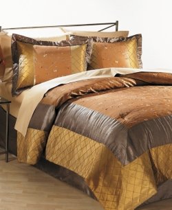 Dress you bed from top to bottom in the Aeron 8-Piece bedding ensemble from High Country. Warm hues combine with fun textures to create this collection. Ensemble includes comforter, two standard shams, 200 thread count sheet set and bedskirt. Sheet set includes flat sheet, fitted sheet and two standard pillowcases.