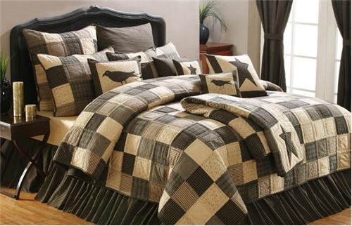 Kettle Grove showcases a classic country patchwork in shades of khaki, black & charcoal amid plaids, florals, and stripes. Quilts reverse to a black with khaki plaid, the same fabric found in the fabric pillows, bed skirts, panels & valances.