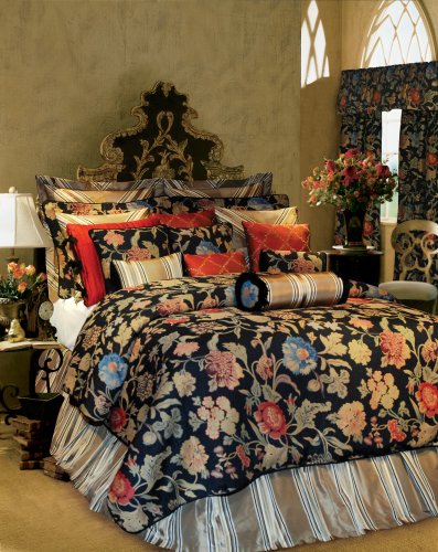 Let your bedroom make a bold statement with this ensemble boasting a tapestry floral design in an inspired color palette of gold, aqua and red on a daring black ground. The black cording on the oversized comforter and decorative pillows offers the highest element of elegance. The split-corner bedskirt provides contemporary flair with a black and khaki striped 18" drop and the matching Euro shams offer mitered black and khaki stripes with button closures. The 18" square floral pillow reverses to stripes while the 20" square red quilted silk pillow offers ribbon ties on the sides. The other 20" square pillow matches the Euro shams with a black and khaki mitered stripe design. The boudoir pillow has black fringe detailing, a black ground tapestry front and reverses to black and khaki stripes that match the bed skirt and Euro shams. The khaki and black striped neck roll pillow has black fringed ends. Comforter sets include an oversized comforter (90x92" full, 100x95"queen, 110x95" king/California king), two shams (standard for full & queen, king for king and California king), and a bed skirt with an 18" drop for all mattresses. Made in USA.