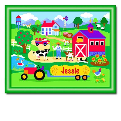Holy cow! Our personalized Country Farm framed print has more animals than Old MacDonald! Your little country bumpkin' will love seeing their name in this fun farm scene with all the chickens, cows, sheep, goats and big red barn! This spectacular framed art will make an exciting change in any bed or play room!