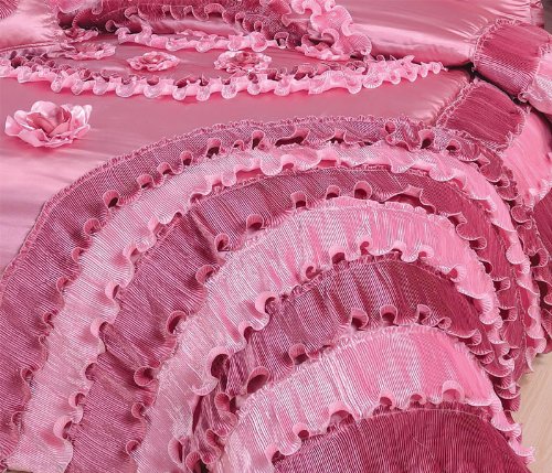 Rose color lighter pink ruffles with stripe border and begonia flower. Comforter sets are designed to keep you updated and fashionable in the most convenient and inexpensive way. Comforter set includes: One comforter, two shams, two cushion covers. Also it could be dry clean or machine wash warm, tumble tumble dry gentle/ low or drip dry, and use mild detergent and no bleach.