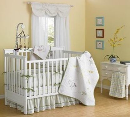 Zen Garden Crib Set This style is offered as a quilt which is a natural beauty. Embroidered motifs of ferns and dragonflies abound on a natural cotton densely machine quilted in a vermicelli stitch. Coordinated with two contemporary prints of a dot and stripe provide an updated harmonious nursery style. Soft cotton percale and polyester fill. 10 piece set inculdes: "comforter; 34""x43" "dust ruffle""27x51+13" crib sheet 28"x52"+7.5" valance "15 x 60" diaper-stacker 12x23" "+8" mobile, complete attachements for crib, plastic with fabric sleeve and stuffed ornaments to match crib 3 piece wall art 10" x 10" various styles self hanging. Blanket, 280 gsm coral fleece 100% polester with embellishment or coordinating fabric edge finish. Bumper Pad set sold seperately. All sheeting and base cloth printed fabrics used by style are 100% cotton 200 Thread Count 100% Polyester Filling.
