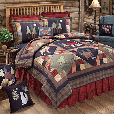 Own a little piece of the great outdoors with this Timberline Lodge Quilt. Carefully hand stitched appliqués of bears, moose, and a cabin in the woods in true navy, hunter green, country red, tan and brown.